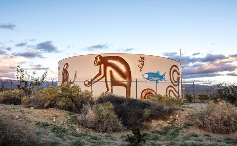 Local artist Lerma creates inimitable art that reflects the Mexican community and traditions in his hometown of Coachella. His 360- degree mural emblazoned on a giant water tank uses American Southwest images to evoke the story of migration.