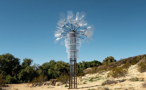 Nestled in a plot of land in Desert Hot Springs, Ryan has reconstructed the iconic desert fan palm into a 20-foot version fabricated with manmade materials of steel, plastics and glass. Wait to see what happens when it catches reflections of the sun.